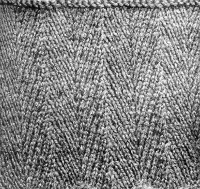 Right Front—With No. 7 needles, cast on 71 sts, work in pattern for 8½ inches. Bind off 4 sts at beg of the next row at underarm, P 2 tog at beg of the next 4 rows at underarm. Work even for 2 more inches. At beg of the next row at front, bind off 4 sts. Change to No. 3 needles and repeat yoke pattern (P 2, K 1) for 3 inches, bind off 10 sts at beg of the next row at neck edge. Now K 2 tog at beg of every row at neck edge, until 39 sts remain. Bind off 7 sts at beg of every row at shoulder, 5 times and continue to K 2 tog at neck edge, until all sts are bound off. Work left front to correspond.