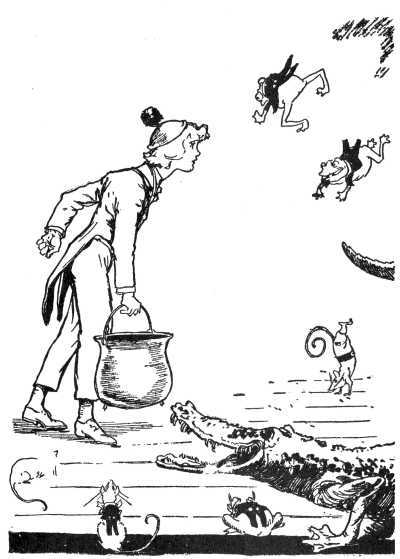 The Skeezers quickly recognized the three Adepts at Magic, whom they had learned to respect before their wicked Queen betrayed them, and welcomed them as friends. All the inhabitants of the village had been greatly frightened by their imprisonment under water, but now realized that an attempt was to be made to rescue them.