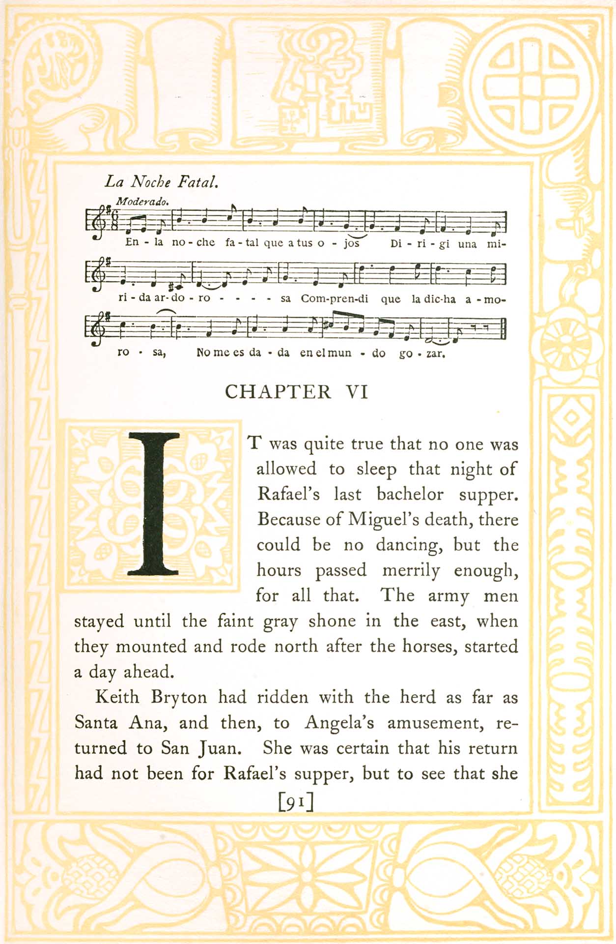 He closed the door behind them. Old Polonia crouched unnoticed beside it, and in perhaps ten minutes he came out again, and started to walk the road to the sea. Rafael saw him, and laughed at the queer crack-brained padre who preferred walking [373] to riding a good horse. Others laughed also, and the dance went on, until the partners of Doña Angela grew impatient, and a gay party with guitars started to encircle the plaza for her, singing love-songs of appeal as they went.