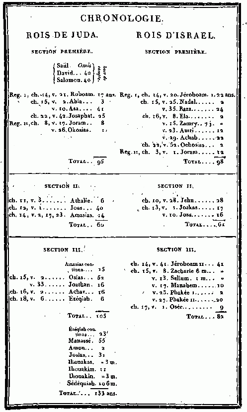 Il faut en convenir de bonne foi; presque toutes les dates comparées du Livre des Rois sont inexactes, et leur inexactitude forme un système tellement lié, qu'on ne saurait l'attribuer tout entier à la négligence des copistes.... Il est bien plutôt l'ouvrage d'u rédacteur même, qui composa cet extrait abrégé des archives officielles après le retour de Babylone. Nous n'entrerons pas dans les détails fastidieux et péu importants de tous les articles: nous nous bornerons à proposër pour les 23 ans de la Section III, deux corrections qui la redressent presque entièrement.