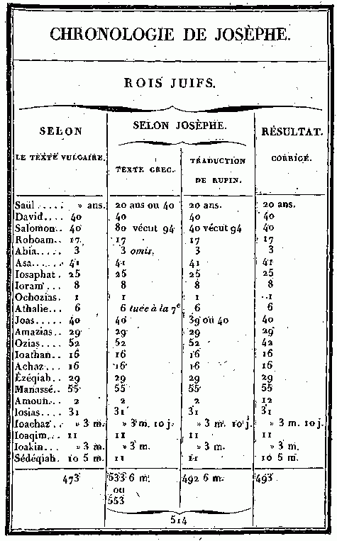 De plus, Josèphe dans un autre passage[7] des mêmes manuscrits grecs, corrige l'erreur des 22 ans, lorsque, récapitulant la durée des rois de Jérusalem, il dit: «Et ces rois régnèrent pendant «un espace de 514 ans, 6 mois, 10 jours, sur lesquels Saül, premier roi, mais qui ne fut point du sang de David, régna 20 ans.» La version de Rufin porte les mêmes nombres de 514 et 20: par conséquent les 22 du premier passage sont évidemment une erreur, ou plutôt une altération du copiste, qui a eu un motif que nous allons bientôt voir.