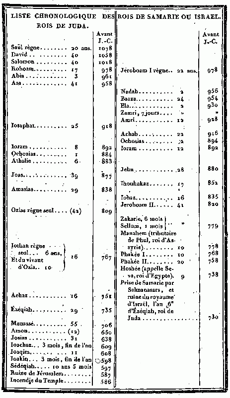 LE tableau ci-contre, dressé fidèlement d'après le texte du Livre des Rois, démontre à trois époques diverses, prises dans la liste des rois de Samarie et celle des rois de Jérusalem, des discordances de corrélation qui ne devraient pas exister; car, certains règnes devant commencer et finir ensemble à une même date selon le texte, les sommes d'additions devraient être les mêmes à l'époque où on les compare. Par exemple, dans la colonne des rois de Samarie, Section 1re, ces princes comptent 3 ans de plus que ceux de Juda.... Dans la 2e, une année seulement; et dans la 3e, ils ont 23 ans de moins.