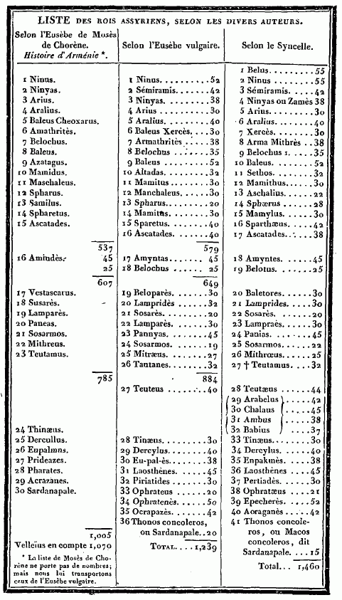 [244] En faveur d'Hérodote sont Denys d'Halicarnasse, Ussérius, Conringius, Marsham, Prideaux, Newton, Bossuet, Montfaucon, Dom Calmet, etc. En faveur de Ktésias sont Diodore, Justin, Eusèbe, Scaliger, Petau, Pezron, Desvignoles, etc.
