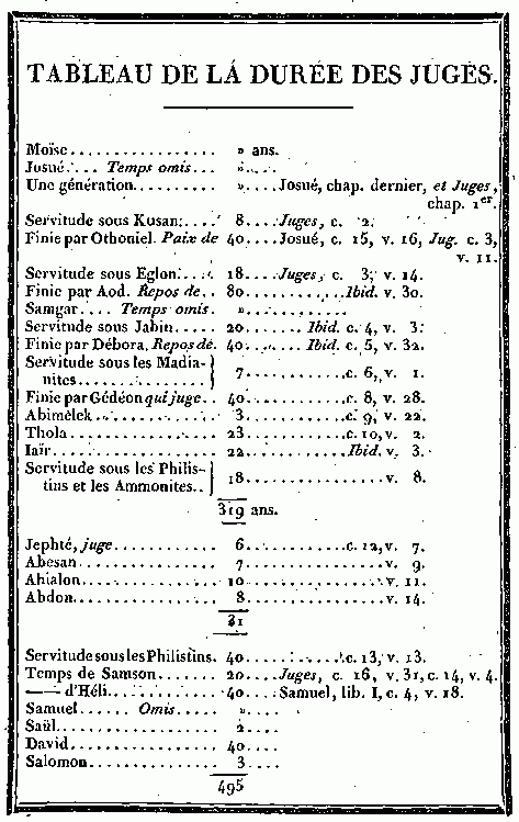 Cependant, en n'admettant avec le texte hébreu que deux ans pour Saül; en tenant pour nuls Moïse, Josué, les Vieillards et Samuel, nous avons..... 495 ans.