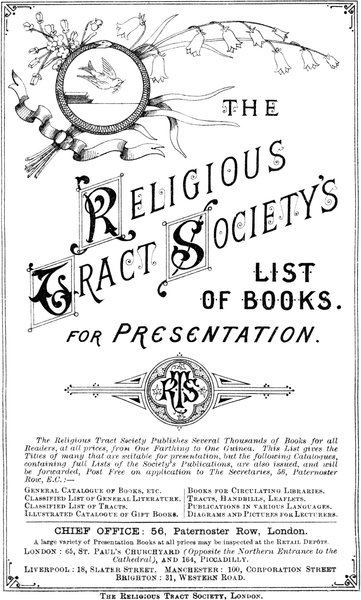 The Religious Tract Society Publishes Several Thousands of Books for all Readers, at all prices, from One Farthing to One Guinea. This List gives the Titles of many that are suitable for presentation, but the following Catalogues, containing full Lists of the Society's Publications, are also issued, and will be forwarded, Post Free on application to The Secretaries, 56, Paternoster Row, E.C.:—