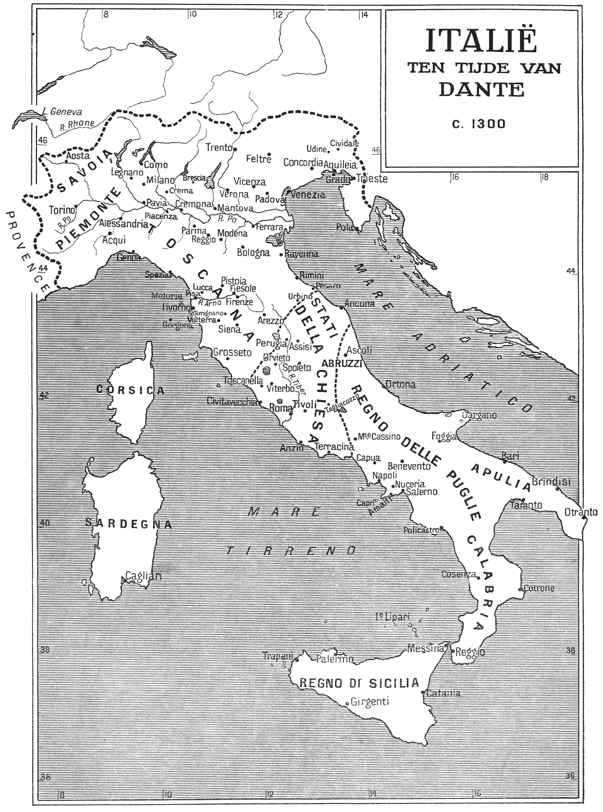 Derhalve kunnen wij aannemen, dat de geschiedenis van het middeleeuwsche Italië begint met het jaar 476. Na dat jaar stond Italië slechts tijdelijk en niet rechtstreeks in verband [IX]met het Oostelijke Keizerrijk, dat sommigen het latere Romeinsche Keizerrijk willen noemen, maar dat volgens mij, omdat “Constantinopolitaansch” een lang woord is, beter “Byzantijnsch” genoemd kan worden, vooral ook daar dit woord Oostersch genoeg klinkt, om een geschikte term te zijn in kwesties over kunst en geschiedenis.