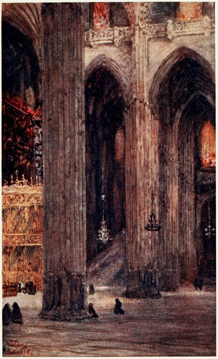The Cathedral stands third in point of size if the ground space is alone considered, after St. Peter's at Rome and the Mesquita at Cordova. The proportions of the lofty nave, one hundred feet in height, are so good that it appears really much higher. The columns of the double aisles break up the two hundred and sixty feet of its width and add much to the solemn dignity of the vast interior, enhanced greatly by the height of the vaulting above the spectator. Standing anywhere in the Cathedral I felt that there was a roof above my head, but it seemed lost in space. And this is the great characteristic of Seville's Cathedral, i.e., space.