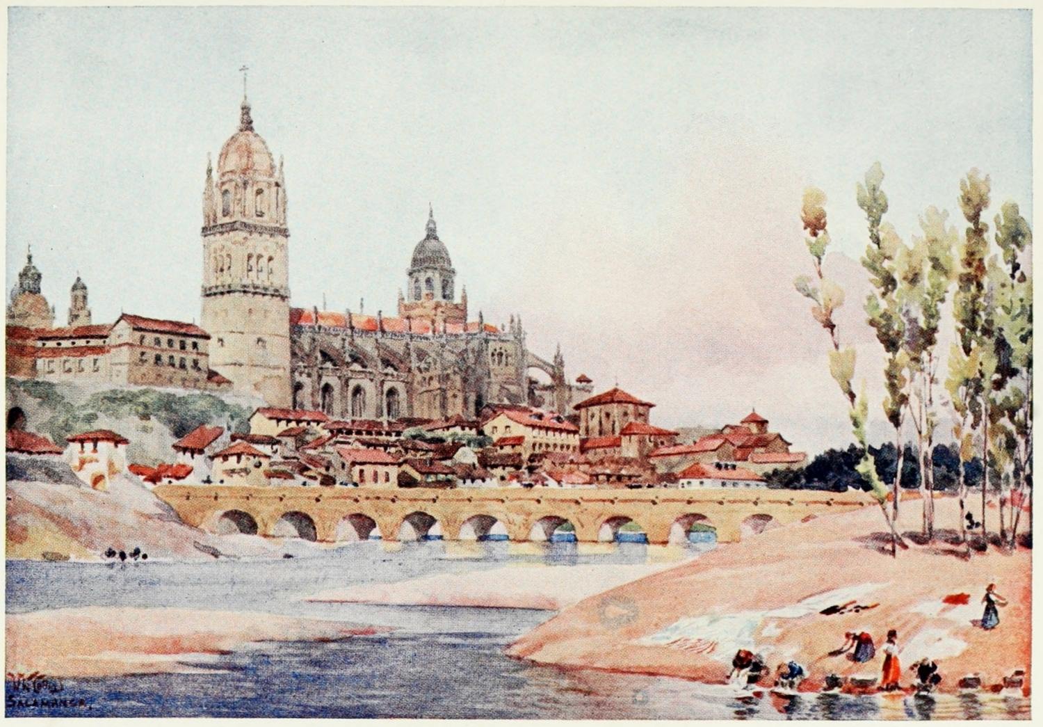 This fine bridge, erected by the Infidel on Roman foundations, is approached at the city end by a Doric gateway, built by Herrera in the reign of Philip II., that Philip who married Mary of England. It consists of sixteen arches and is guarded at its southern extremity by the Calahorra or Moorish Tower, round which the road passes instead of through a gateway, thus giving additional security to the defence.