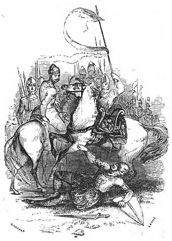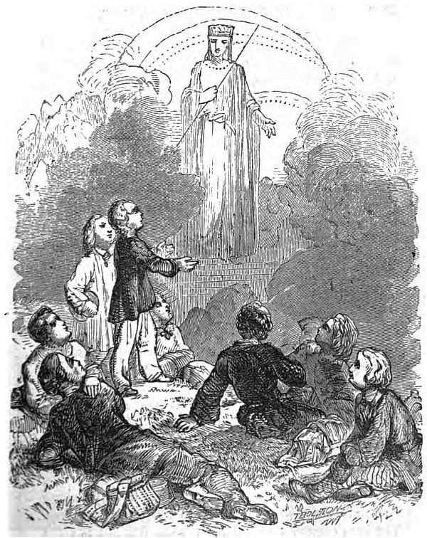 “Ah, time flies along, and yet Miss Becky does not, at all events, remind us of it,” said Sir Hugh. Whereat Miss Becky, who was very fair and somewhat fat, laughed and shook hands heartily with Sir Hugh and Lady Worsley, and smiled affectionately at Julia and little Hugh, and we commenced our homeward walk. How enjoyable it was—how pleasant was, our light luncheon! for we dined at five that we might have a long evening. We all looked forward to the evening with great delight. Scarcely was dinner over than a sound was heard—a bell in the hall striking sweetly. We all jumped up, led by Master Peter, and arranging ourselves, some on the great oak staircase and others in a circle at its foot, we stood listening to the Christmas chimes and other tunes struck up by a dozen or more men with different-toned bells—one in each hand. Scarcely had they ceased and received their accustomed largesse from Sir Hugh’s liberal hands, than some young voices were heard coming up the avenue. They, as were the rest, were admitted at a side-door, through the servants’ hall, where tea and ale, and bread-and-cheese, and cakes, and other good things, were ready to regale them. The young singers came trooping into the hall, one pushing the other forward; shy and diffident, though they well knew that they had no reason to fear the lord of that mansion nor any one present. At length they arranged themselves, and the leader of the band beginning, they all chimed in, and sang, if not in a way to suit a fastidious taste, at all events, with feeling and enthusiasm, a beautiful Christmas carol. The words are simple, but often as I have heard them I have never failed to feel my heart lifted up to that just and merciful God who formed and carried out that great and glorious work, the scheme of the Redemption, thus wonderfully reconciling the demands of justice with love and mercy towards the fallen race of man. Surely this is a theme on which angels must delight to dwell, and to which they must ever with joy attune their voices and their harps; so I used to think then and so I think now, and hope to think till I reach the not unwelcome grave, and find it a happy reality. Several hymns and other appropriate songs were sung by the children, and then the leader began to sidle towards the door, while the rest nudged and elbowed each other, and at length they all shuffled demurely out again, but not a minute had passed before they were heard shouting and laughing right merrily in the servants’ hall. Their places were quickly supplied by a very different set of characters. They were dressed with cocked hats and swords, and uniforms of generals and princes, which, though highly picturesque, were not of a very martial character, or calculated to stand much wear and tear, being chiefly adorned with coloured paper and tinsel. The tones of their voices showed that, notwithstanding the lofty-sounding names they assumed, they were not of an aristocratic rank, nor, though they all spoke in poetry, was that of a very marked order. There was Julius Caesar, and Mark Antony, and Caractacus, and the Black Prince, and King Arthur, and Richard the Third, the Emperor Alexander, Marshal Blücher, and several other heroes, ancient and modern, including Napoleon Bonaparte and the Duke of Wellington. Some were tall, and some were short, and some fat, and others thin, and I had, even then, strong doubts whether they bore any similarity to the heroes they represented as to figure, while, certainly, they were not in any way particular as to correctness of costume. One little chap, who was evidently looked upon as a star, came forward and announced that he was Julius Caesar, and a short time afterwards he informed us that he was Marshal Blücher. Having marched round the hall in a very amicable way, they ranged themselves in two parties opposite each other. One hero on one side defying another on the other, they rushed forward and commenced, in the ancient Greek and Trojan fashion, a furious verbal combat, always in verse, the last lines in one case being: