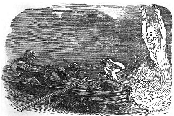 “The foremast had hitherto stood secure, though weakened by the loss of the mainmast, but now as the tempest came down stronger on us, that too tottered, and went by the board, carrying the bowsprit with it. As this last accident happened, the captain’s wife shrieked with terror; it was answered by a shout of shrill laughter, so loud, so piercing, and so unnatural, that it made the heart of every one on board tremble. It might well do so, for as we looked over the side of the driving ship, what should we see right abreast of us, in a small skiff, gliding over the frothy summits of the waves, but the very old woman who had uttered such dreadful curses at us as we were quitting Liverpool—Dame Kirby! There she sat in the stern sheets of the boat, steering by an oar with one hand, while the left bony arm was stretched out pointing derisively at us, and her countenance, as full of malignant revenge as is possible for any being possessing human features, was turned full upon us. A large sail was hoisted on the single mast, enough, one would have supposed, to lift the light skiff right out of the water; but she sat as composedly as if she were floating on a lake on a summer’s evening; her boat did not seem to ship a drop of water, nor ever to sink into the trough of the sea, but it somehow or other went along on the summit of every wave.