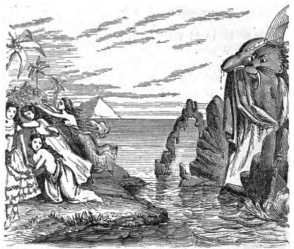 “The captain stood firm, clasping his wife in his arms, for she had from the first refused to go below. His countenance, as the lightning flashed brightly round him, looked deadly pale; she had fainted, and was happily senseless. A third time the ship lifted, and down she came with a tremendous crash, every timber in her parting at the instant. Two things I saw at that awful moment: the despairing countenance of the captain as the foaming waves whirled him and her he loved away in their wild embrace, his starting eyeballs to the last fixed on the malignant features of the fearful witch, whom I beheld sailing round us in her skiff, unharmed, among the breakers, her loud shrieks of triumphant laughter sounding high above the roaring of the tempest.
