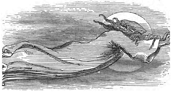 “I have not yet described her. She had in her youth been very tall, but she was now bent nearly double, though she contrived to raise herself at times of great excitement to nearly her former height. She was thin and wizened, with large prominent features, and eyes once large, now sunk so deep in her head that they would have been scarcely perceptible, except from their extraordinary lustre. In her hand she carried a long twisted staff to support herself, and she wore a red cloak and a queer little hat, from under which her long grey locks straggled in the wind. Her gown, such as it was, all rags and tatters, was looped up in front to enable her to walk, and as she raised herself up, her long bony leg, which was advanced forward, looked so like that of a skeleton that it was impossible to believe that it belonged to a living being. Her arms, which were also quite bare, appeared composed of nothing but bone and sinew, and the skin which covered them, like that of her face, was as yellow as parchment. They, as well as her hands and fingers, were of great length, and as she walked along in her usual way, she almost touched the ground with them. When the captain first saw her standing directly in front of him, with her hideous features scowling malignantly on him, appearing, as she did, the prominent figure, while his friends faded in the distance, he started back and trembled violently. He quickly, however, recovered himself, especially when he found his wife, who had come upon deck, close to his side. Her presence seemed to enrage the old woman greatly. She slowly raised up her bent body till she seemed taller than any woman I ever saw, and stretching out her staff, waved it round and round in the direction of the ship.