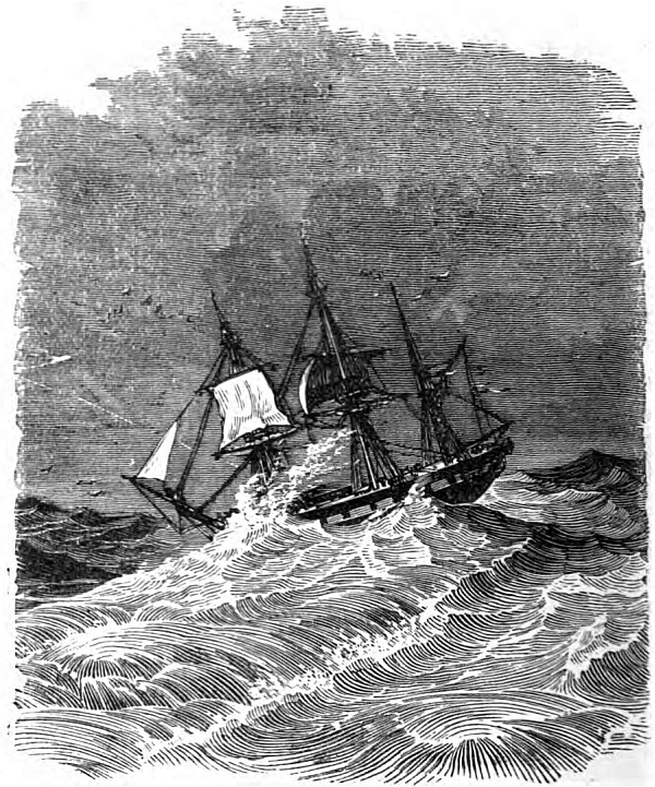 “One would have supposed that we had had enough of storms and accidents for one voyage, but we had soon to learn that we had something more to go through. Mrs Derick had by this time become something like herself again, and as for the captain, though he felt more than any one, he never changed. He sang and joked as much as ever, and even sneered at the old woman and her jolly-boat, as he called it. I cannot describe what happened every day of the voyage, so I must merely mention the most remarkable events. It was in the afternoon watch, when, as I was sweeping the horizon with my glass, I observed an unusual dark appearance on the water. Some said that it was a sand-bank, others an island, some a shoal fish, but I saw that it was a heavy squall driving furiously over the hitherto smooth unruffled sea. I was not mistaken. I called Captain Derick on deck, and the hands were sent aloft to lower topgallant yards and to furl every sail, except the fore-topsail, which was closely reefed. The men sprang to their duty, for they saw that not a moment was to be lost. The ship was put before the wind just in time. Down came the squall upon us, roaring, and tearing, and hissing along the ocean. Away we flew before it like a sea-bird on the wing. Our only danger was lest we should not be far enough to the south to clear the land of the Patagonians—the renowned Cape Horn.