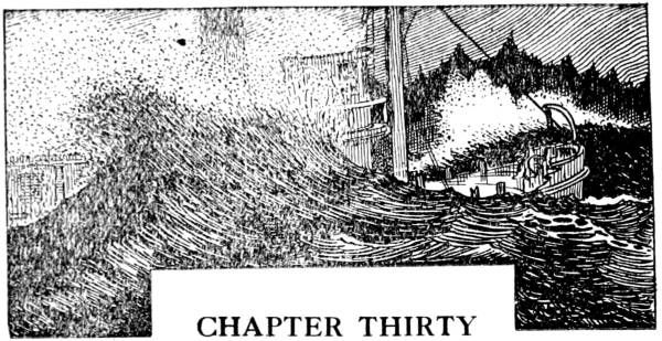 Up on the Point, Donald, shivering in his wet underwear, hauled the stout rope ashore and was lashing a block to a tree trunk when several men with lanterns appeared. They stared at him in astonishment, and in answer to their questions he pointed to seaward and replied huskily, “There she is! Steerin’ gear wheel rope parted and she grounded on the ledge yonder. I’m rigging a breeches-buoy to bring the folks ashore.... Here! Fix this. My hands are numb! Look sharp or the old hooker will be falling to pieces in the pounding she’s getting out there now!” The men—Eastville folks who had come out to the Point to see what had delayed the steamer—set to work and rigged the gear under McKenzie’s direction. Within ten minutes they were hauling the first passengers ashore.