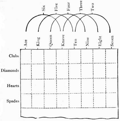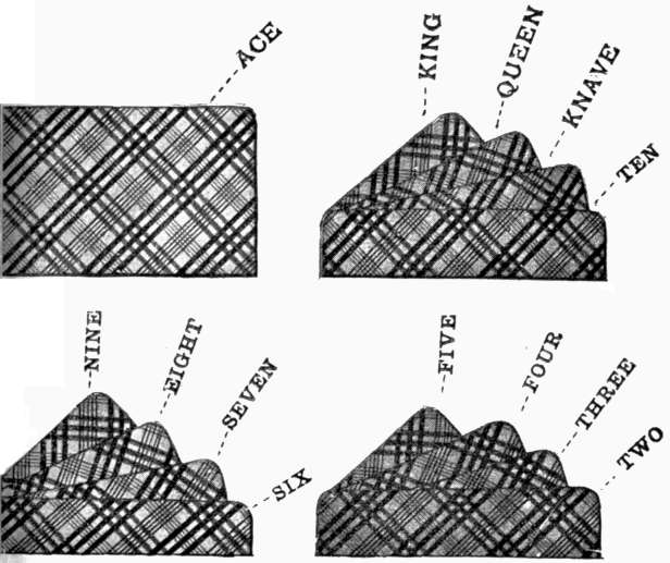 'For suit pick out two figures near those you use for size, [303]and have both dark for Clubs, and both light or natural for Diamonds, have one of them dark for Spades; and the other dark for Hearts. With six figures the combination runs similar to the five figures which we have ezplained, and a four figure runs the same down to the seven spot. After a little practice you will see many ways of marking your cards.