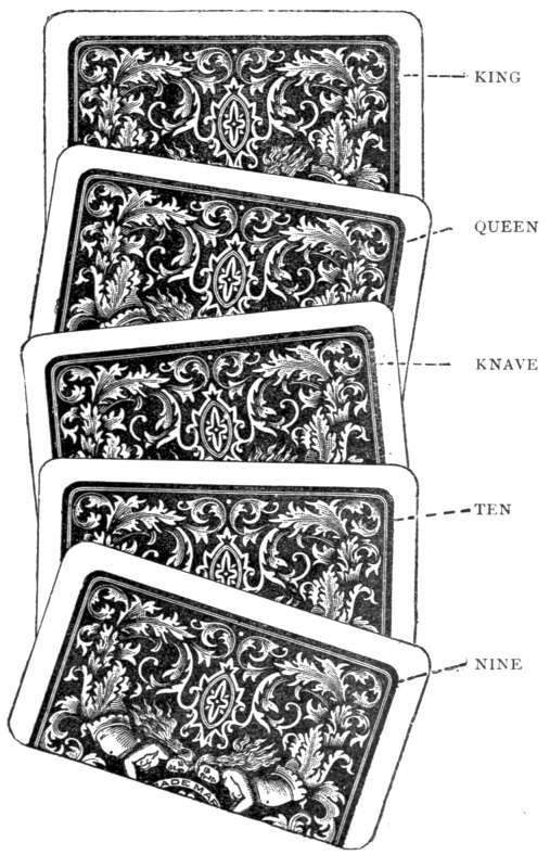 'Directions.—When you part the pack to shuffle press down a trifle and the cards will part to an Ace (the Ace will be on top of the lower part) put that part with the Ace on top and part again to another Ace now shuffle in all but the four top cards, part the cards again to the third Ace and shuffle in all but the top four cards, then put three cards on top of the last Ace (this puts up three Aces with three cards between them and three on top and is for a four handed game) if one more or less than four are playing shuffle in one more or less cards, (always have as many cards between and [305]on top of the Aces as there are players excluding yourself) when the left hand man deals and offers the cards to you to cut you can shuffle them up in the same way (but you must put "one less" card on top of the three Aces to get the Aces yourself)'