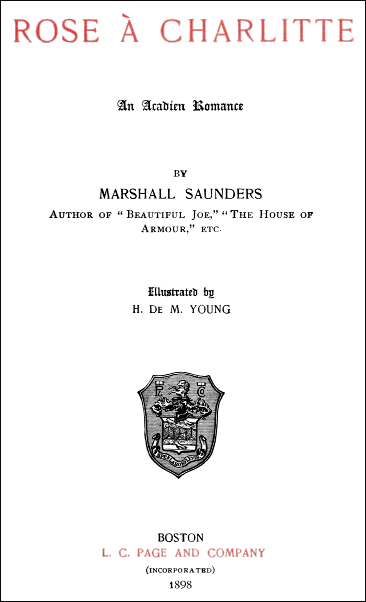 In this novel, the scene of which is laid principally in the land of Evangeline, Marshall Saunders has made a departure from the style of her earlier successes. The historical and descriptive setting of the novel is accurate, the plot is well conceived and executed, the characters are drawn with a firm and delightful touch, and the fortunes of the heroine, Rose à Charlitte, a descendant of an old Acadien family, will be followed with eagerness by the author's host of admirers.
