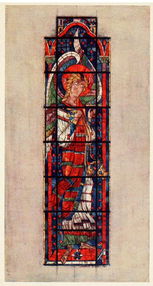 But below the transom the window is still unspoilt. In the midst stands Michael with sword and scales, and below him the dead are rising naked from their graves. Michael himself, it must be confessed, is a somewhat lackadaisical figure; it was not possible for an artist of that time and school to give a figure the arresting quality of the Methuselah in Plate III.; neither does one's eye linger long over the Saved, who troop up the golden stairs on Michael's right, but is irresistibly attracted to the other side of the picture, where in a great glow of ruby glass are seen the Flames of Hell, to which devils—grey and blue at the outer edge of the fire, but darker and more purple as they are farther in—are carrying the wretched 263 souls of the Lost. Just outside the flames an angel and a devil are fighting in mid-air for the possession of a soul, and a comparison of these figures with the similar ones in the Descent into Limbo or "Harrying of Hell," which is by the same hand as the east window, shows at once the difference between the work of the two men.