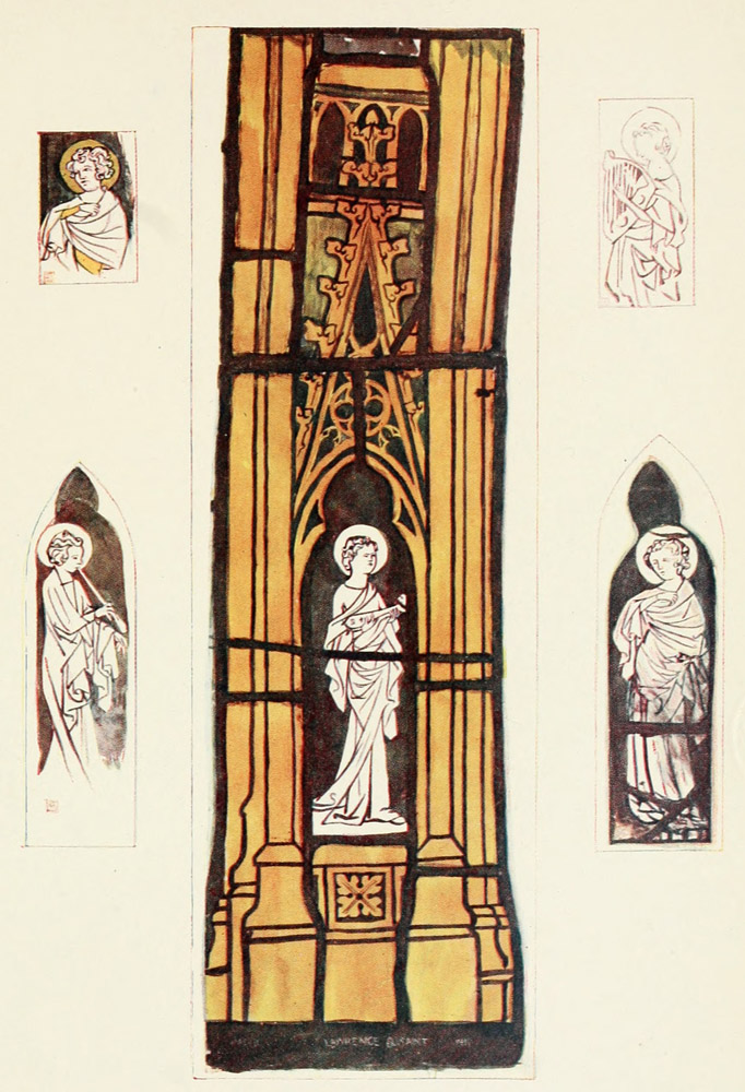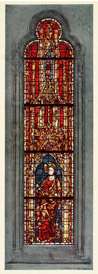 The new point of view naturally affected the canopy, which is shaded like solid stone-work, giving it a heavy and clumsy effect. In many of the subject windows, however, the canopy is omitted altogether, the sky of the picture, which is sometimes white, with clouds and circling swifts painted on it, continuing right up to the stone-work.
