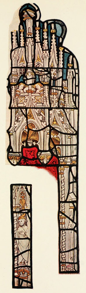 There is a good deal of fifteenth century work still remaining at Rouen, though there seems to be a gap in the list of maîtres verriers to the 246 Cathedral from 1386 to 1426. It was during this gap, however, in the year 1400, that a window, which still remains, was placed in the clerestory of the Cathedral at Evreux. The general plan of this window is that of those later fourteenth century windows in which the whole light was filled with towering canopy work. The canopy differs only slightly in detail from the late fourteenth century type, though there is a more decided attempt at perspective in it, but, like the English work of the time, it is all white, touched with stain, and the general effect of the window is much whiter than that of earlier work. The drawing of the figures, which represent the donor, Bishop Guillaume de Cantier, presented to the Virgin by St. Catherine, does not show any very great change from late fourteenth century work.