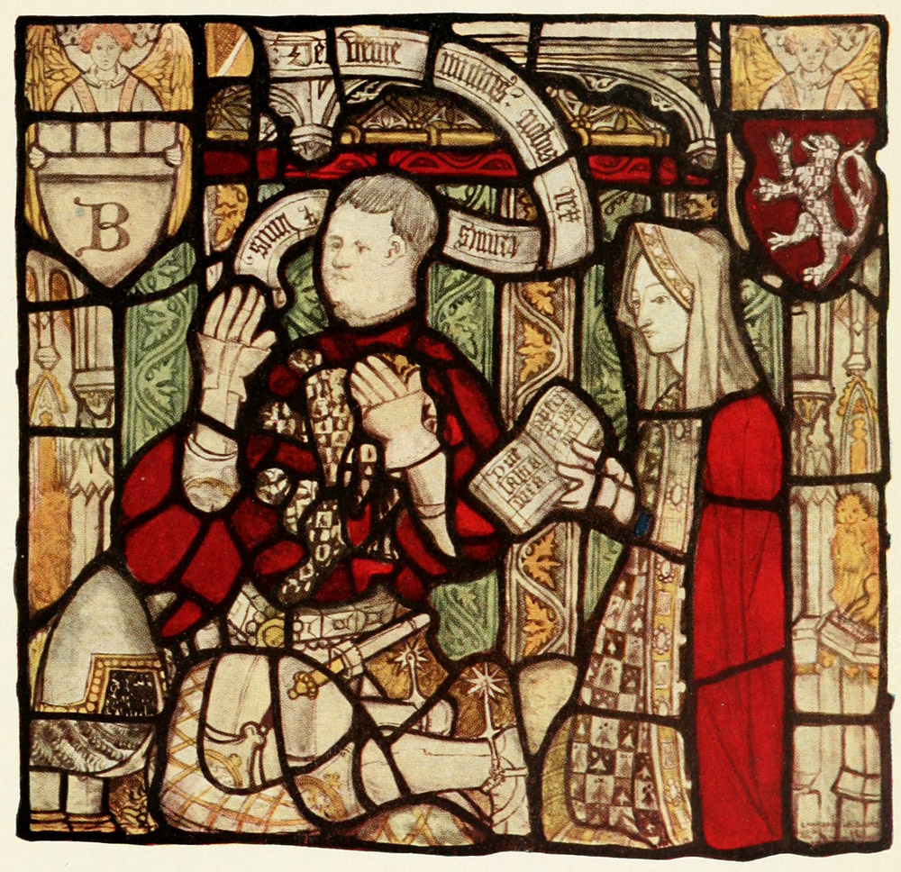 Below are the donors, Nicholas Blackburn, twice Mayor of York, and his wife Margaret (Plate XXXVI.), facing his son, also named Nicholas, and his wife, also named Margaret. The window has unfortunately been a good deal restored, and the background to the Blackburns is modern and was, I should think, originally blue. Modern, too, is the vivid green of the younger Nicholas's cloak. Margaret Blackburn, the elder, carries a book with the words, "Domine, labia mea aperies et os meum." The same verse occurs also, if I remember right, in a lady's hand at Selby Abbey. Were Yorkshire women, one wonders, so very silent?