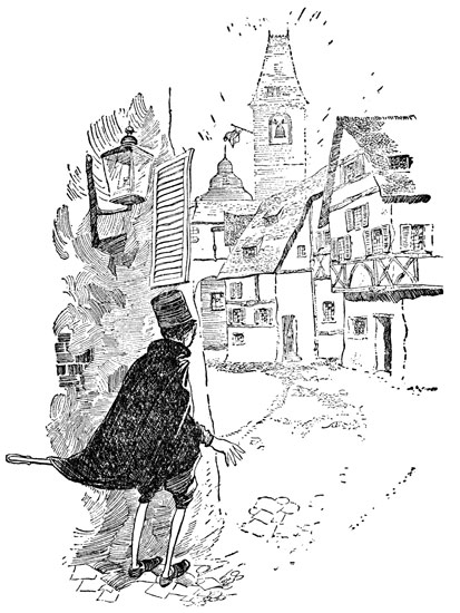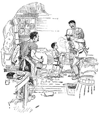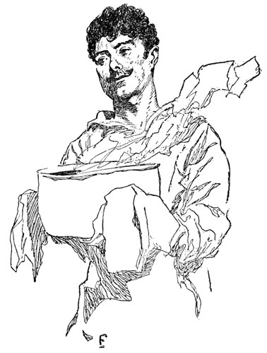 But Coccorito could now sing in peace and be as insolent as he liked because the general was no longer paying any attention to him, for two excellent reasons. First, because, in spite of his high rank, he was not great enough to reach up to the second-floor window; second, and more important, because at the moment that his pipe fell in the street a carriage stopped in front of the house and out of it got a gentleman, a lady, and ... a small box they were carrying, and it was against this box that the strange projectile fell, making such a clatter that the lady couldn't help uttering a few words 203 of protest. Win-the-War, who never allowed any one to outdo him in courtesy, found it necessary to explain matters, and with the help of his orderly got up from his chair and dragged himself to the railing of the terrace.