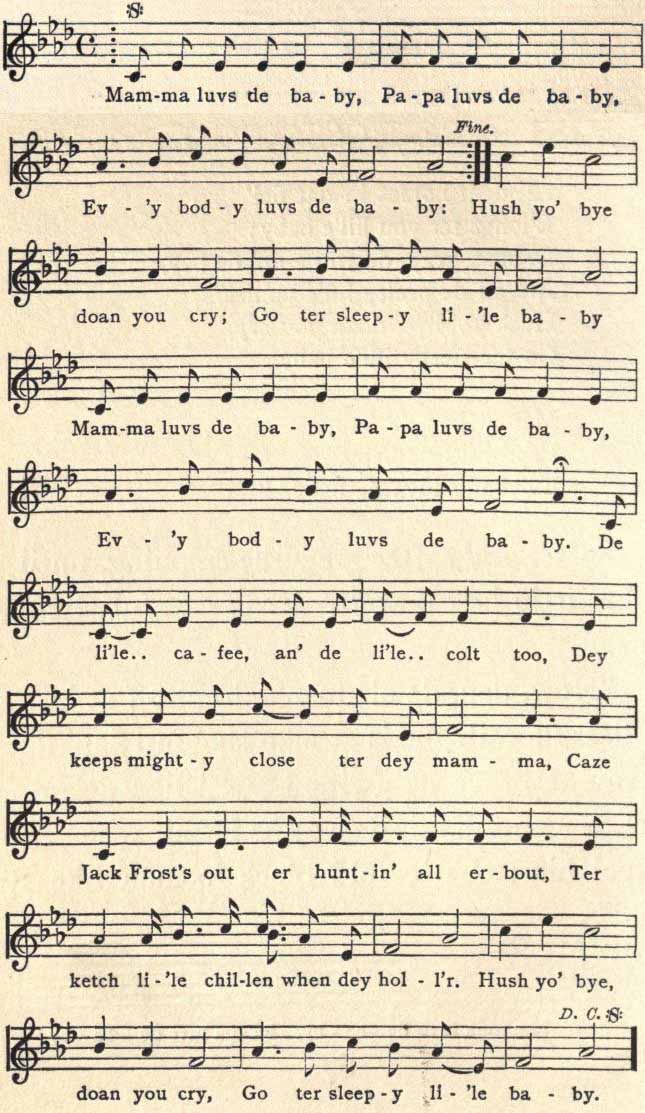 But in the nursery we had by necessity the[Pg 11] moral laws grafted on the African mind by master and mistress through daily association and the singular application of these is within the memory of many grown-up Southern children. I take issue with those who declare that the black Mammy did have equal authority in the punishment of refractory children. I have never known an instance in which punishment by her was inflicted in blows. A child might be dragged forcibly to its nursery, restrained by a turned key or remorselessly carried away to solitude, in arms, but struck, never! Blows were unnecessary with the wise-old Mammy. There were the cupboard and pantry, the fruit orchard, the kitchen stove, and there were the birds, beasts and fowls to be invoked in song and story. Thus were the children restrained, guided and taught, and doubtless[Pg 12] many a flower in our literary gardens to-day is but an old-time seed matured. This is the best side of the picture. The seed was not always well chosen; the impression, a good one. All black Mammies were not good and superstitions fertilized with fear were often sown in childish minds never to be eradicated. The writer to this day could not under any temptation bring himself to touch a spider or sleep in the dark and somehow feels that life will not be entirely complete without a chance to even up with the female Senegambian who filled his mind with weird stories Saturday nights and prepared him for religious service Sunday mornings.