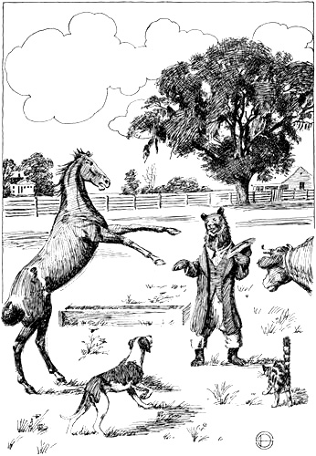 [Pg 333]In the dim perspective of the street a flying object arrested my thoughts. An instant more and it developed into one of my hopefuls tearing like mad on a four-year-old colt, without saddle or bridle. “Help! Catch him!” I cried, as I threw up the window sash. Passers-by rushed to the rescue as the colt took the hedge, crossed the lawn, and halted under the window without a quiver.