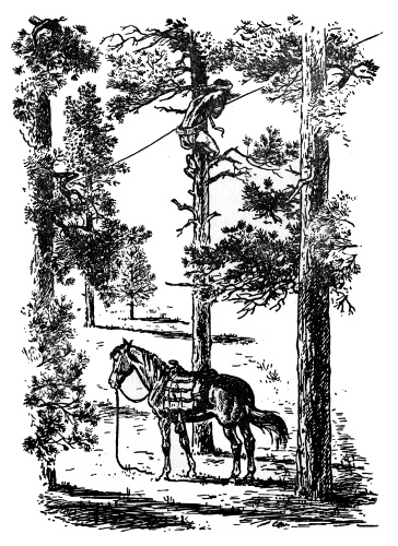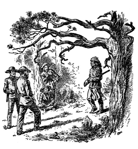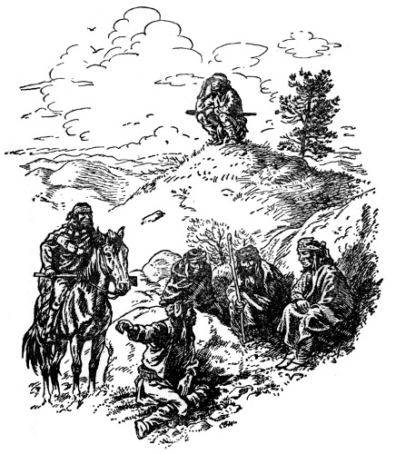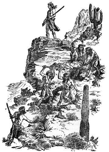 This was desert country, and they stopped in a cluster of rocky hills. Delgadito and Chie dismounted and climbed the tallest hill to scout from its summit. Soon they returned and told the others to dismount too. Tether ropes were slipped about the necks of the loose horses, which were now led by the raiders as all went on quietly.