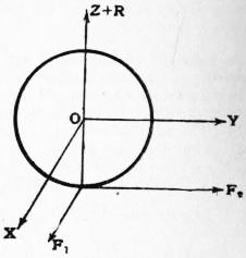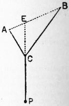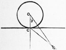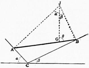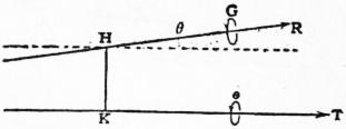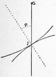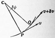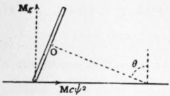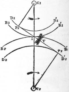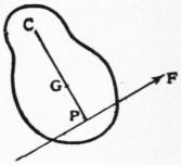 and a deviation dα of rotation about an axis drawn through G parallel to O, to produce which there would be required a couple of the moment M given by equation (83). According to the principles of statics, the resultant of the force P, applied at G perpendicular to the plane OG, and the couple M is a force equal and parallel to P, but applied at a distance GC from G, in the prolongation of the perpendicular OG, whose value is