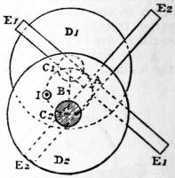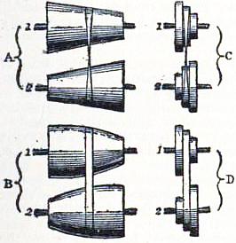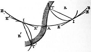 § 123. Energy distributed between two Bodies: Projection and Propulsion.—Hitherto the effort by which a machine is moved has been treated as a force exerted between a movable body and a fixed body, so that the whole energy exerted by it is employed upon the movable body, and none upon the fixed body. This conception is sensibly realized in practice when one of the two bodies between which the effort acts is either so heavy as compared with the other, or has so great a resistance opposed to its motion, that it may, without sensible error, be treated as fixed. But there are cases in which the motions of both bodies are appreciable, and must be taken into account—such as the projection of projectiles, where the velocity of the recoil or backward motion of the gun bears an appreciable proportion to the forward motion of the projectile; and such as the propulsion of vessels, where the velocity of the water thrown backward by the paddle, screw or other propeller bears a very considerable proportion to the velocity of the water moved forwards and sideways by the ship. In cases of this kind the energy exerted by the effort is distributed between the two bodies between which the effort is exerted in shares proportional to the velocities of the two bodies during the action of the effort; and those velocities are to each other directly as the portions of the effort unbalanced by resistance on the respective bodies, and inversely as the weights of the bodies.