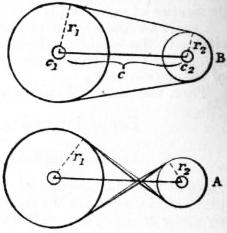 § 122. Brakes.—A brake is an apparatus for stopping and diminishing the velocity of a machine by friction, such as the friction-strap already referred to in § 103. To find the distance s through which a brake, exerting the friction F, must rub in order to stop a machine having the total actual energy E at the moment when the brake begins to act, reduce, by the principles of § 96, the various efforts and other resistances of the machine which act at the same time with the friction of the brake to the rubbing surface of the brake, and let R be their resultant—positive if resistance, negative if effort preponderates. Then