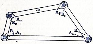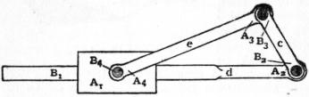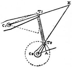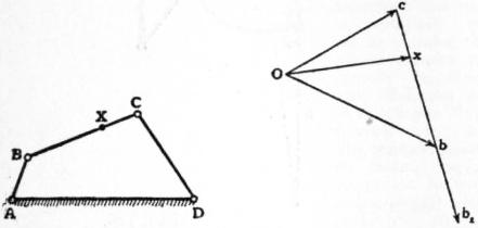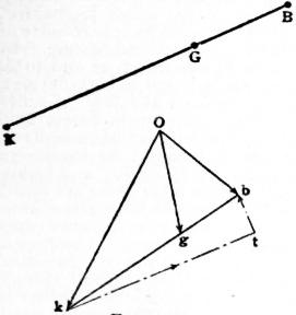 § 126.* To find the force competent to produce the instantaneous acceleration of any link of a mechanism.—In many practical problems it is necessary to know the magnitude and position of the forces acting to produce the accelerations of the several links of a mechanism. For a given link, this force is the resultant of all the accelerating forces distributed through the substance of the material of the link required to produce the requisite acceleration of each particle, and the determination of this force depends upon the principles of the two preceding sections. The investigation of the distribution of the forces through the material and the stress consequently produced belongs to the subject of the Strength of Materials (q.v.). Let BK (fig. 134) be any link moving in any manner in a plane, and let G be its centre of gravity. Then its motion may be analysed into (1) a translation of its centre of gravity; and (2) a rotation about an axis through its centre of gravity perpendicular to its plane of motion. Let α be the acceleration of the centre of gravity and let A be the angular acceleration about the axis through the centre of gravity; then the force required to produce the translation of the centre of gravity is F = Wα/g, and the couple required to produce the angular acceleration about the centre of gravity is M = IA/g, W and I being respectively the weight and the moment of inertia of the link about the axis through the centre of gravity. The couple M may be produced by shifting the force F parallel to itself through a distance x. such that Fx = M. When the link forms part of a mechanism the respective accelerations of two points in the link can be determined by means of the velocity and acceleration diagrams described in § 82, it being understood that the motion of one link in the mechanism is prescribed, for instance, in the steam-engine’s mechanism that the crank shall revolve uniformly. Let the acceleration of the two points B and K therefore be supposed known. The problem is now to find the acceleration α and A. Take any pole O (fig. 49), and set out Ob equal to the acceleration of B and Ok equal to the acceleration of K. Join bk and take the point g so that KG: GB = kg : gb. Og is then the acceleration of the centre of gravity and the force F can therefore be immediately calculated. To find the angular acceleration A, draw kt, bt respectively parallel to and at right angles to the link KB. Then tb represents the angular acceleration of the point B relatively to the point K and hence tb/KB is the value of A, the angular acceleration of the link. Its moment of inertia about G can be found experimentally by the method explained in § 125, and then the value of the couple M can be computed. The value of x is found immediately from the quotient M/F. Hence the magnitude F and the position of F relatively to the centre of gravity of the link, necessary to give rise to the couple M, are known, and this force is therefore the resultant force required.