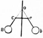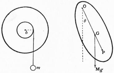 § 125.* To find the moment of inertia of a body about an axis through its centre of gravity experimentally.—Suspend the body from any conveniently selected axis O (fig. 48) and hang near it a small plumb bob. Adjust the length of the plumb-line until it and the body oscillate together in unison. The length of the plumb-line, measured from its point of suspension to the centre of the bob, is for all practical purposes equal to the length OC, C being therefore the centre of percussion corresponding to the selected axis O. From equation (85)