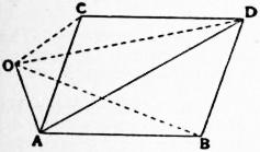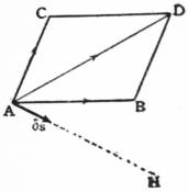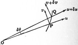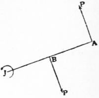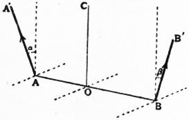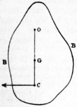 Now (fig. 133) let the required deviation be a rotation of the body BB about an axis O, not traversing the centre of gravity G, dα 1017 being, as before, the deviation of angular velocity to be produced in the interval dt. A rotation with the angular velocity α about an axis O may be considered as compounded of a rotation with the same angular velocity about an axis drawn through G parallel to O and a translation with the velocity α. OG, OG being the perpendicular distance between the two axes. Hence the required deviation may be regarded as compounded of a deviation of translation dv = OG · dα, to produce which there would be required, according to equation (82), a force applied at G perpendicular to the plane OG—