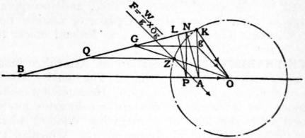 The finding of F may be continued thus: join AK, then AK is the acceleration image of the rod, OKA being the acceleration diagram. Through G, the centre of gravity of the rod, draw Gg parallel to the line of stroke, thus dividing the image at g in the proportion that the connecting rod is divided by G. Hence Og represents the acceleration of the centre of gravity and, the weight of the connecting 1018 rod being ascertained, F can be immediately calculated. To find a point in its line of action, take a point Q on the rod such that KG × GQ = R2, R having been determined experimentally by the method of § 125; join G with O and through Q draw a line parallel to BO to cut GO in Z. Z is a point in the line of action of the resultant force F; hence through Z draw a line parallel to Og. The force F acts in this line, and thus the problem is completely solved. The above construction for Z is a corollary of the general theorem given in § 127.