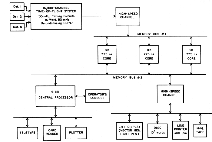 On-line data-acquisition computer systems are made in a wide range of types and sizes. In all cases at least one electronic computer is involved—a stored-program machine—because wired-program devices such as pulse-height analyzers are not considered to be computers. The rest of the system typically consists of input/output (I/O) devices such as analog-to-digital converters (ADC's), printers, cathode-ray oscilloscopes, plotters, and control devices, which may include, in addition to the console typewriter, switch boxes to simplify the control of special types of operations and perhaps a set of logic circuits associated with the input system, used to provide preliminary selection of incoming data. In a small but increasing number of cases a computer is seen dedicated entirely to a "process-control" application such as the automatic adjustment of the shim coils of a variable-energy cyclotron or the control of data acquisition in a nuclear-scattering experiment, adjustments such as changing the angle of observation being made essentially under direct automatic control of the computer. The smallest on-line systems use the smallest commercially available computers; the largest use computers bigger than those which until recently served most computing centers. Large systems sometimes include one or more satellite computers. The cost of individual systems ranges from $25,000 to $1,000,000, approximately. The total cost of computer systems in low-energy nuclear laboratories is estimated by now to have reached about $20,000,000. (There has been a larger expenditure in the high-energy nuclear field, where computer systems have been employed extensively for some years longer and where experiments are so expensive that the economic advantages of computer use were quickly recognized.)