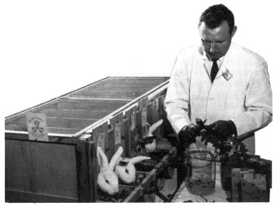 As most people know, radiation also affects animal tissue. The zoologist wants to know how and why this is true and how varying conditions alter animal reactions to radiation. The research of the animal physiologist is basic to later medical applications of radiation to human beings. The veterinary scientist has the grave responsibility of testing radioisotopes, radiation drugs, chemicals, surgical procedures, and various combinations of these in animals to determine which can be used to diagnose or cure disease in man. He passes his findings on to the physician for further research only after he has made every possible test and evaluation. Sometimes he works with chemists, nutritionists, bacteriologists, and other scientists. What happens to animals could happen to human beings, and that is why physiologists watch carefully the animals that eat radioactive[Pg 15] foods and study the offspring of animals that have been exposed to radioactivity.