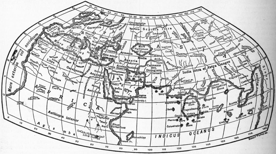 Among Greek works written during this period there are several which either give us an idea of the maps available at that time, or furnish information of direct service to the compiler of a map. Among the latter a Periplus or coastal guide of the Erythrean Sea, which clearly reveals the peninsular shape of India (A.D. 90) and Arrian’s Periplus Ponti Euxeni (A.D. 131) which Festus Avienus translated into Latin. Among travellers Eudoxus of Cyzicus occupies a foremost rank, since, between 115-87 B.C. he visited India and the east coast of Africa, which subsequently he attempted in vain to circumnavigate by 636 following the route of Hanno, along the west coast. Among geographers should be mentioned Posidonius (135-51), the head of the Stoic school of Rhodes, who is stated to be responsible for having reduced the length of a degree to 500 stadia; Artemidorus of Ephesus, whose “Geographumena” (c. 100 B.C.) are based upon his own travels and a study of itineraries, and above all, Strabo, who has already been referred to. Among historians who looked upon geography as an important aid in their work are numbered Polybius (c. 210-120 B.C.), Diodorus Siculus (c. 30 B.C.) and Agathachidus of Cnidus (c. 120 B.C.) to whom we are indebted for a valuable account of the Erythrean Sea and the adjoining parts of Arabia and Ethiopia. The Periegesis of Dionysius of Alexandria is a popular description of the world in hexameters, of no particular scientific value (c. A.D. 130). He as well as Artemidorus and others accepted a circular or ellipsoidal shape of the world and a circumfluent ocean; Strabo alone adhered to the scientific theories of Eratosthenes.