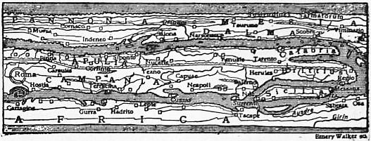 Map-Making among the Romans.—We learn from Cicero, Vitruvius, Seneca, Suetonius, Pliny and others, that the Romans had both general and topographical maps. Thus, Varro (De rustici) mentions a map of Italy engraved on marble, in the temple of Tellus, Pliny, a map of the seat of war in Armenia, of the time of the emperor Nero, and the more famous map of the Roman Empire which was ordered to be prepared for Julius Caesar (44 B.C.), but only completed in the reign of Augustus, who placed a copy of it, engraved in marble, in the Porticus of his sister Octavia (7 B.C.). M. Vipsanius Agrippa, the son-in-law of Augustus (d. 12 B.C.), who superintended the completion of this famous map, also wrote a commentary illustrating it, quotations from which of Ammianus Marcellinus of Antioch (d. 330), Pliny and others, afford the only means of judging of its character. The map is supposed to be based upon actual surveys or rather reconnaissances, and if it be borne in mind that the Roman Empire at that time was traversed in all directions by roads furnished with mile-stones, that the Agrimensores employed upon such a duty were skilled surveyors, and that the official reports of the commanders of military expeditions and of provincial governors were available, this map, as well as the provincial maps upon which it was based, must have been a work of superior excellence, the loss of which is much to be regretted. A copy of it may possibly have been utilized by Marinus and Ptolemy in their compilations. The Romans have been reproached for having neglected the scientific methods of map-making advocated by Hipparchus. Their maps, however, seem to have met the practical requirements of political administration and of military undertakings.