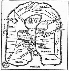 Ptolemy’s great merit consists in having accepted the views of Hipparchus with respect to a projection suited for a map of the world. Of the two projections proposed by him one is a modified conical projection with curved parallels and straight meridians; in the second projection (see fig. 3) both parallels and meridians are curved. The correct relations in the length of degrees of latitude and longitude are maintained in the first case along the latitude of Thule and the equator, in the second along the parallel of Agisymba, the equator and the parallels of Meroe, Syene and Thule. Following Hipparchus he divided the equator into 360° drawing his prime meridian through the Fortunate Islands (Canaries). The 26 special maps are drawn on a rectangular projection. As a map compiler Ptolemy does not take a high rank. In the main he copied Marinus whose work he revised and supplemented in some points, but he failed to realize the peninsular shape of India, erroneously exaggerated the size of Taprobane (Ceylon), and suggested that the Indian Ocean had no connexion with the western ocean, but formed Mare Clausum. Ptolemy knew but of a few latitudes which had been determined by actual observation, while of three longitudes resulting from simultaneous observation of eclipses he unfortunately accepted the least satisfactory, namely, that which placed Arbela 45° to the east of Carthage, while the actual meridian distance only amounts to 34°. An even graver source of error was Ptolemy’s acceptance of a degree of 500 instead of 700 stadia. The extent to which the more correct proportion would have affected the delineation of the Mediterranean is illustrated by fig. 4. But in spite of his errors the scientific method pursued by Ptolemy was correct, and though he was neglected by the Romans and during the middle ages, once he had become known, in the 15th century, he became the teacher of the modern world.
