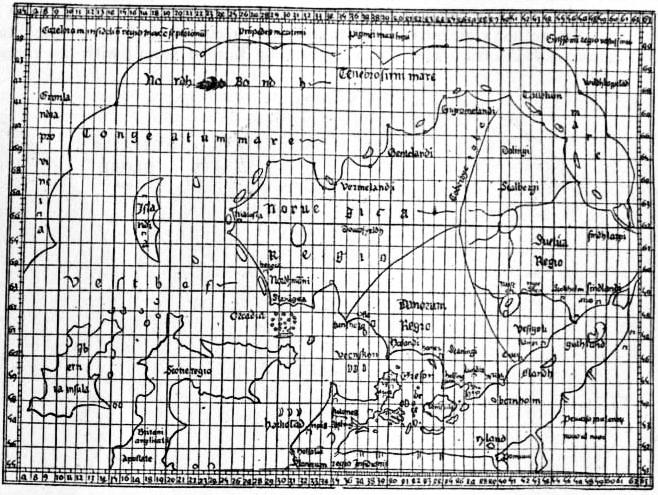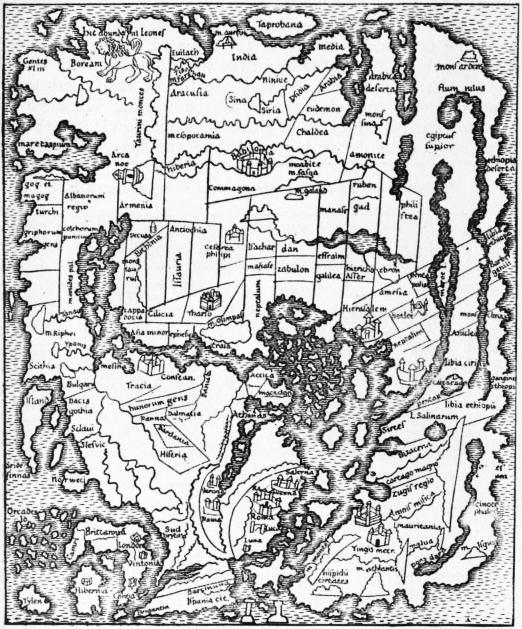 Eratosthenes is the author of a treatise which deals systematically with the geographical knowledge of his time, but of which only fragments have been preserved by Strabo and others. This treatise was intended to illustrate and explain his map of the world. In this task he was much helped by the materials collected in his library. Among the travellers of whose information he was thus able to avail himself were Pytheas of Massilia, Patroclus, who had visited the Caspian (285-282 B.C.), Megasthenes, who visited Palibothra on the Ganges, as ambassador of Seleucus Nicator (302-291 B.C.), Timosthenus of Rhodes, the commander of the fleet of Ptolemy Philadelphus (284-246 B.C.) who wrote a treatise “On harbours,” and Philo, who visited Meroe on the upper Nile. His map formed a parallelogram measuring 75,800 stadia from Usisama (Ushant island) or Sacrum Promontorium in the west to the mouth of the Ganges and the land of the Coniaci (Comorin) in the east, and 46,000 stadia from Thule in the north to the supposed southern limit of Libya. Across it were drawn seven parallels, running through Meroe, Syene, Alexandria, Rhodes, Lysimachia on the Hellespont, the mouth of the Borysthenes and Thule, and these were crossed at right angles by seven meridians, drawn at irregular intervals, and passing through the Pillars of Hercules, Carthage, Alexandria, Thapsacus on the Euphrates, the Caspian gates, the mouth of the Indus and that of the Ganges. The position of all the places mentioned was supposed to have been determined by trustworthy authorities. The inhabited world thus delineated formed an island of irregular shape, surrounded on all sides by the ocean, the Erythrean Sea freely communicating with the western ocean. In his text Eratosthenes ignored the popular division of the world into Europe, Asia and Libya, and substituted for it a northern and southern division, divided by the parallel of Rhodes, each of which he subdivided into sphragides or plinthia—seals or plinths. The principles on which these divisions were made remain an enigma to the present day.