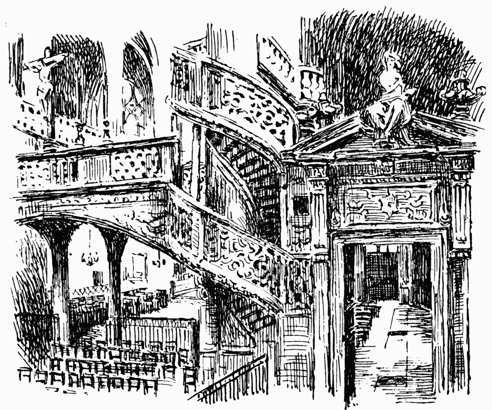 To my readers I would say peruse what I have written, but use your own eyes, your own keen observation for learning much more than could be noted here. Look into every courtyard in the ancient quarters, look attentively at every dwelling along the old winding streets, and fail not to look up to their roofs. The roofs are never alike. They are strikingly picturesque. Old world builders did not work mechanically, did not raise streets in machine-like style, each structure exactly like its neighbour, one street barely distinguishable from the street running parallel or crossing it, according to the habit of to-day. The builders of les jours d’antan loved their craft; every single house gave scope for some artistic trait. The roofs offered a fine field for architectural ingenuity: wonderfully planned windows, chimneys, balconies, gables are to be seen on the roofs often in most unexpected corners, in every part of the Vieux Paris. Look up!—I cannot urge this too strongly. And within every old hôtel—the French term for private house or mansion—examine each staircase. In the erection of a staircase the architect of past ages found grand scope for graceful lines, and exquisite workmanship. Thus walks even through the dimmest corners of la Ville Lumière will be for lovers of old-time vestiges a joy for ever.