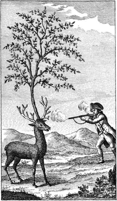 Op een zekeren morgen zag ik door het vengster van mijne slaapkamer, dat een wijde plas, welke daar niet ver af was, overdekt was met wilde ganzen en eenden. Zonder dralen nam ik mijn roer uit den hoek van de kamer, en liep de trappen af, en met zoo groote vaart uit het huis, dat ik mijn hoofd zeer onvoorzigtig tegen den post van de deur stiet. Het vuur sprong mij de ogen uit. Dit toeval belette echter mijn voornemen niet. Maar nauwlijks was ik binnen 't bereik van 't schot gekomen, of ik bemerkte, tot mijn smert, dat door den geweldigen stoot, welken ik zoo even gedaan had, de steen van den haan was afgevlogen. Wat nu gedaan? hier was geen tijd te verliezen. Gelukkig herinnerde ik mij, welke uitwerking de stoot op mijn gezigt gehad had; ik opende daarom de pan, leide aan op de vogels, en sloeg met mijn vuist tegen één mijner ogen(4). Door een goeden slag sprongen de vonken 'er uit; het schot ging af, en ik raakte vijftig koppels ganzen, vier koppels eendvogels en drie koppels teerlingen.—Tegenwoordigheid van geest is de ziel van alle mannelijke oefeningen. Soldaten en zeelieden mogen daaraan veelmaal hun behoud te danken hebben; jagers en schutters hebben, voor hunne beste slagen, aan dezelve geen mindere verpligting.