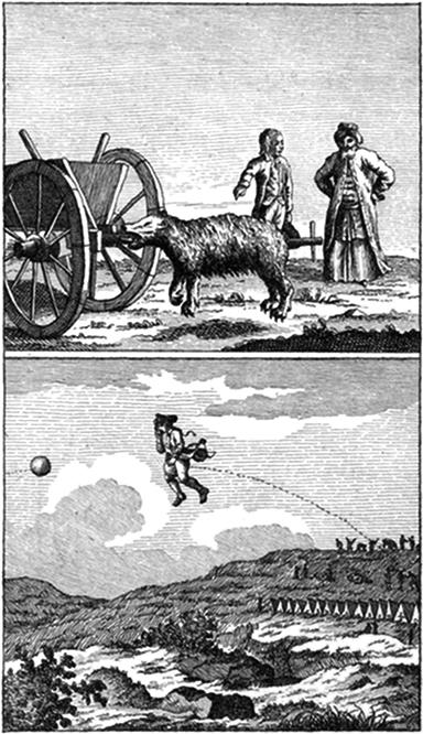 De Baron wordt krijgsgevangen, en voor slaaf verkoft.—Hoedt de bijen van den Sultan, welken aangevallen worden door twee beeren.—Verliest een bij en een zilveren bijl, welken hij naa de beeren smijt; doch die, door het verdraaijen van zijnen arm, opvliegt naa de Maan, maar welken hij, door eene vernuftige uitvinding, naa beneden brengt.—Valt bij zijne terugkomst op de aarde, en redt zig zelve uit eene diepe kuil.—Redt een wagen, welke den zijnen, op een smallen weg ontmoet, op eene zonderlinge wijze. Wonderbaar uitwerksel van de vorst op den posthoren van zijn koetsier.