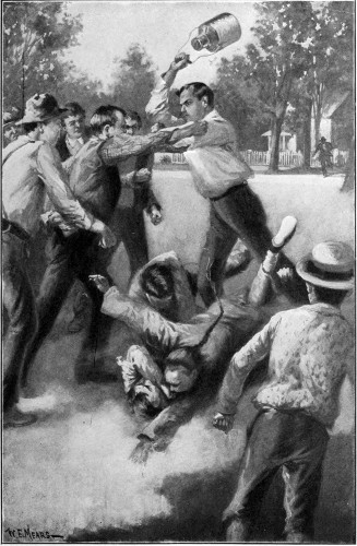 With a hoarse yell of rage, and careless of what might happen to himself, Rob sprang forward, swinging the milk-can above his head as he ran. So busy were the tormentors of the Chinese lad with their sport that the coming of a would-be rescuer was unnoticed until he was close upon them. As poor Jo lost his footing and fell, Rob dashed into the mêlée, dealing telling blows with his milk-can, and scattering the horde of young toughs as though he had been a charge of cavalry. The stopper flew out of the can, and its contents were flung to right and left, impartially drenching friend and foe. Thus, for a minute, the tide of battle flowed with the righteously wrathful Rob and against the cowardly and unrighteous muckers. Then one of the latter, who had not yet been reached by the deadly milk-can, and so could view the proceedings more calmly than could his companions, shouted: