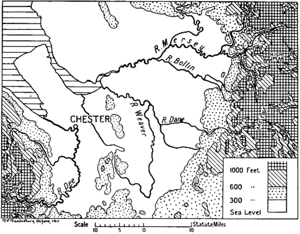 Now look at the map opposite. The shaded portions represent land over 300, 600, or 1,000 feet above sea-level. In the south, the eastern and western uplands slope gradually down towards the bit of white which touches the centre of the bottom of the map and forms what is known as the Cheshire Gap. Through this gap the Midlands lie open to the north-west and to the Cheshire Plain, and over these lower heights naturally passed the great highway from London to the Irish Sea. Chester, built on a rocky plateau at the head of the tidal waters of the Dee and protected on its western side by a natural bend of the same river, was clearly a position of great importance for guarding alike the coast road into North Wales and the roads to the north of England; and there is no doubt that it was held as a fortified post long before the Romans built the Roman city of Deva.