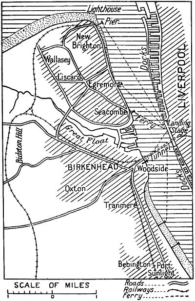 The combined waters of the Etherow, Tame, and Goyt form the Mersey at Stockport. Only the left bank of this river is in Cheshire. Moreover, for a large part of its course it has been 'canalized', so that it no longer flows between its natural banks, but down the artificial channel of the Manchester Ship Canal. The estuary of the Mersey, which is three to four miles across at its widest point, narrows at Birkenhead to a width of barely three-quarters of a mile. At this point the river is kept open to the largest vessels afloat by constant dredging. Here in the docks you may see ships of all nations, and generally one or more of our huge ocean greyhounds riding at 14 anchor in mid-river or awaiting but the turn of the tide to take out their cargoes of human lives to distant lands.