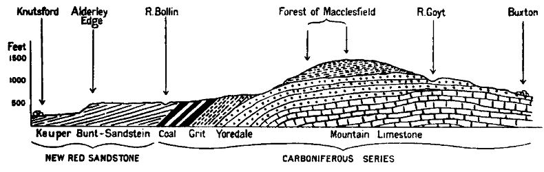 22Unlike the New Red Sandstones, which are found for the most part in flat horizontal beds, the coal beds slope downwards from east to west. This is due to the uplifting of the East Cheshire hills, which we shall presently explain. When this uplift took place, the coal beds, which were originally flat, became raised in the east and equally lowered in the west. When the sea flowed over them they became covered by sandy deposits of such a thickness that in the greater part of Cheshire the coal cannot be reached. The earliest sands laid down formed what are called the Permian rocks, and the later layers the New Red Sandstone series mentioned in the last chapter. The Permian rocks may be well seen at Stockport, in the river beds of the Tame and the Goyt which have cut their way through them. In the strip of country between Stockport and Macclesfield, and again on the south-eastern borders of Cheshire, the upturned edges of the coal beds have been left exposed so that the coal is near the surface and can be easily extracted.