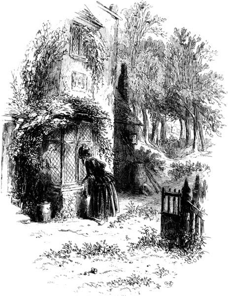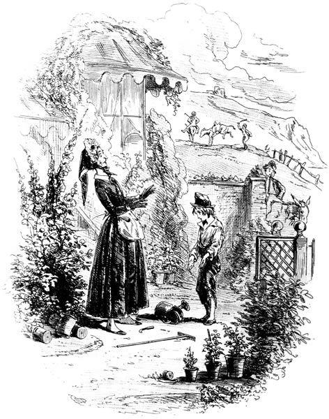 Who is this bent lady, supporting herself by a stick, and showing me a countenance in which there are some traces of old pride and beauty, feebly contending with a querulous, imbecile, fretful wandering of the mind? She is in a garden; and near her stands a sharp, dark, withered woman, with a white scar on her lip. Let me hear what they say.